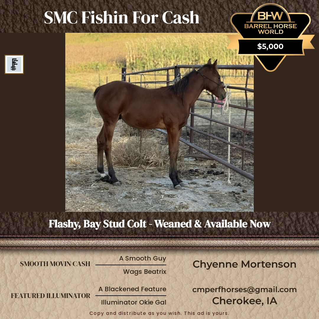 Now offering a standout weanling stud colt bred for performance, presence, and pedigree. This colt is sired by Smooth Movin Cash, a direct son of the legendary A Smooth Guy—known for producing versatile, athletic offspring with calm minds and cow sense.