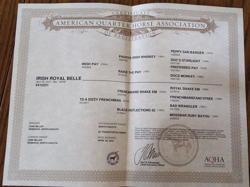 4/28/25 AQHA brown filly by Irish Pay and out of TS A Dizzy Frenchman, a money-winning daughter of Frenchmans Shake Em.