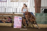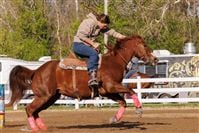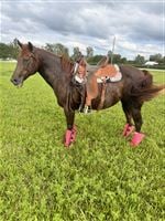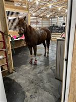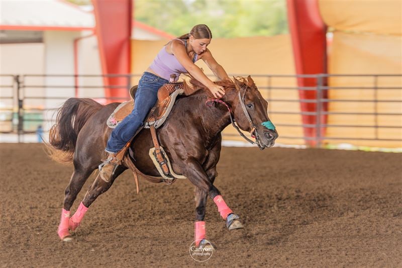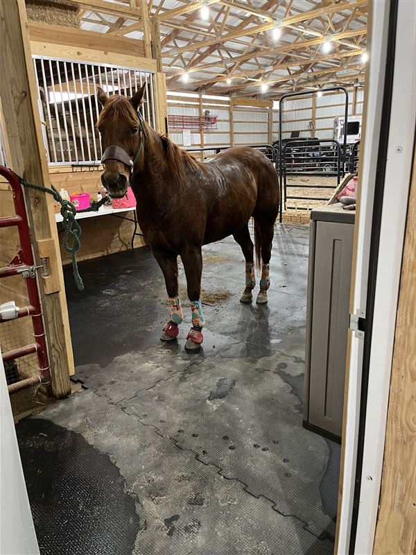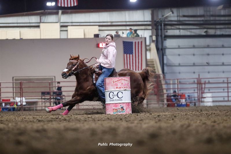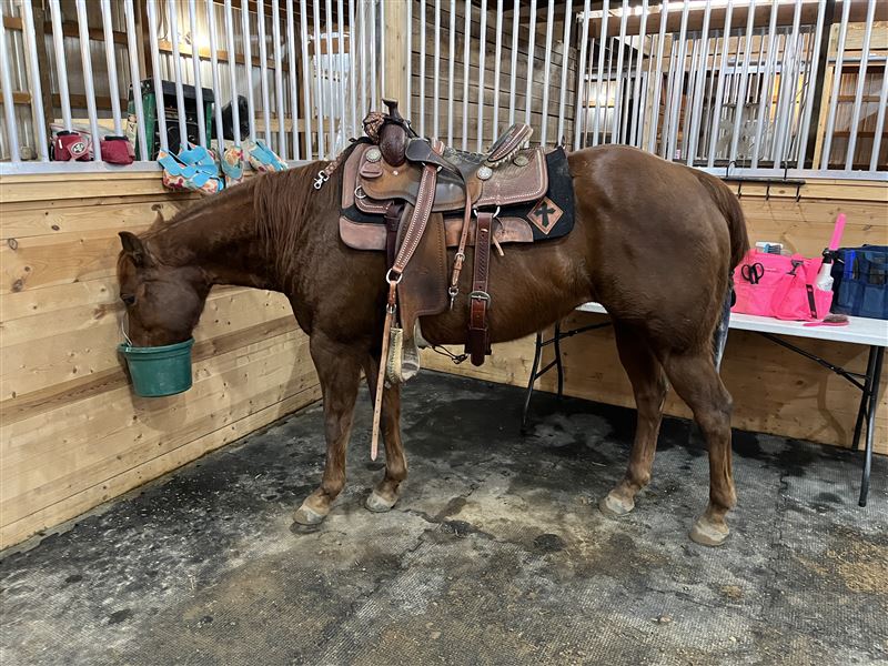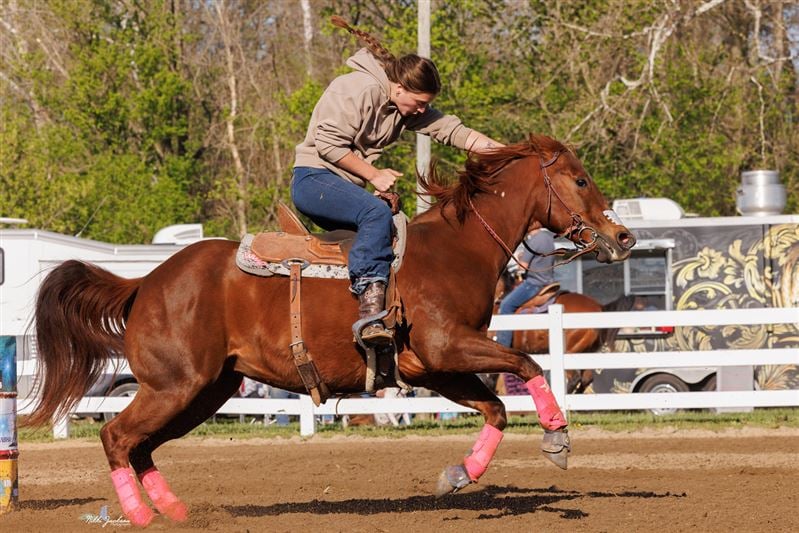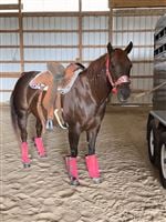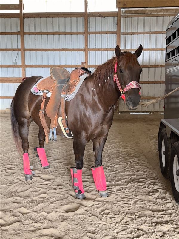 She’s the typical alpha mare in the pasture, but respectful and easy to manage. She never shows when in heat and has zero bad habits under saddle — no buck, rear, bite, or kick. Her only vice is that she can get a little hot — prances and tosses her head a bit — but nothing dangerous. She’s not hot in the alley. Lightly patterned on poles with potential to make a super fast pole horse.