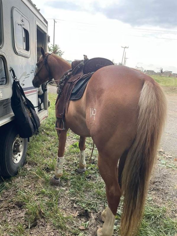 Fancy Bugs is solid and super quiet. Beginners have ridden her in and out of the arena. She will go in and run 1D and you can put a kid on her to walk her around. She has placed in the WPRA, IPRA rodeos (many first place wins), as well as other association’s rodeos. She’s used to being around cattle and gets along well with other horses. She is used to bombs going off and all the usual rodeo atmosphere noises. She will do slow work and is very well broke. She collects, counter arcs, side passes, stops well, and will do flying lead changes. She knows poles but I don’t compete in poles anymore. She has a lot of natural rate. She hauls well, ground ties, clips, ground ties for the farrier along with many other good manners. She is an excellent trail horse, even with first timers! She hasn’t had her legs run off. PESI, AQHA, and Future Fortunes incentives. She is deadly and gritty in track pens but will run in any type of arena. Purchase exams welcome at buyers expense. I raised her and ran her sire and dam. Her sire won the average at St Tite, QU's IPRA rodeo, he was IPRA horse of the year, he was a 2x qualifier for the IFR, Congress sweeptakes finalist and money earner, and AQHA high point barrel and pole stallion, among others things. Her pedigree speaks for itself! Multiple videos on my YouTube Channel @lauraleethomas7414. There's public videos on my Facebook. Equistat and RodeoGo earnings. I have a few dry work videos and confirmation pics upon request.