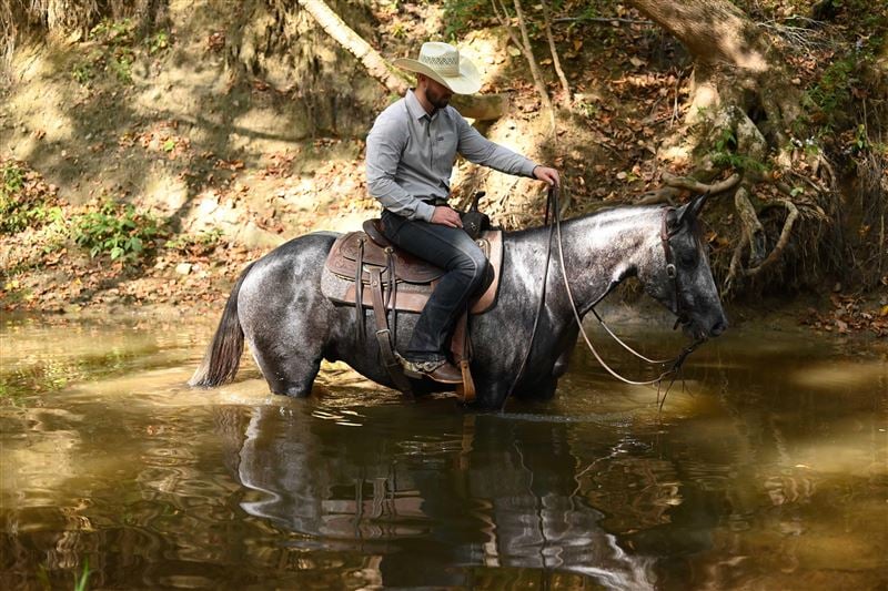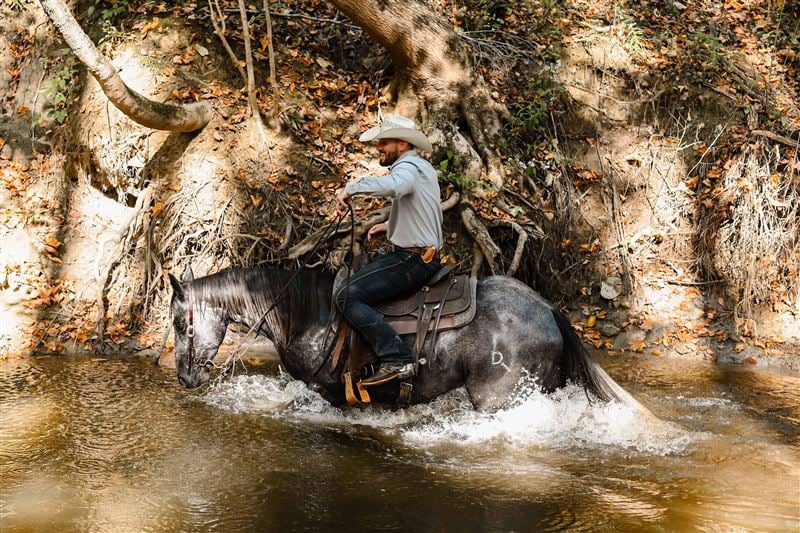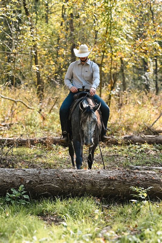 Steel has a resume far beyond his years. He’s been pasture roped on, logged countless miles through thick brush and rough terrain, and been put into high-stress ranch situations that many horses twice his age have never experienced. From deer jumping up in the woods, to equipment clattering down the road, Steel stays calm, focused, and steady. He’s got a good one-hand neck rein, is soft in the bridle, and responsive to both leg and seat cues. He’s handy with all the buttons—side pass, turn around, leg yield—but if you don’t want a performance horse, he’s just as content to relax and enjoy the trail.