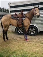 7 yr old AQHA BUCKSKIN gelding- by Guys Easy Jet (Frenchmans Guy), out of a AAA mare. -This gelding is paid in full to FUTURE FORTUNES- Pretty well finished on the barrels ready to add more speed and haul-he’s been put on the back... (Hits 2880)