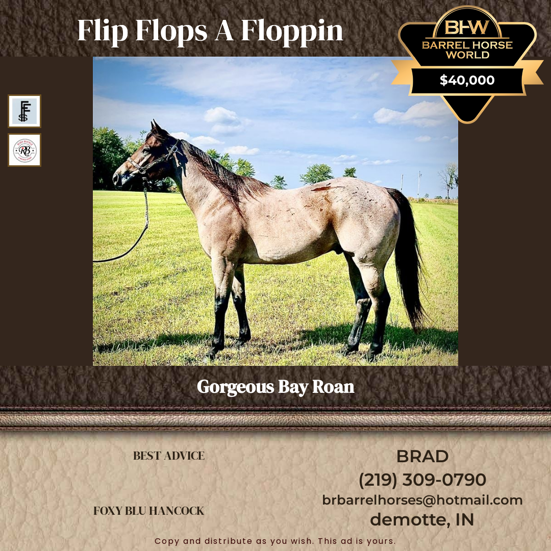 11-year old - Absolutely Gorgeous Bay Roan 🩴👙FLIP FLOPS A FLOPPIN 👙🩴 2014 Bay Roan Gelding 15.2 40,XXX This horse is all that and has the best name ever!! Poles☑️ Rodeo Ready☑️ Future Fortunes ☑️ Ruby Buckle ☑️ Youth Appropriate ☑️... (Hits 3526)