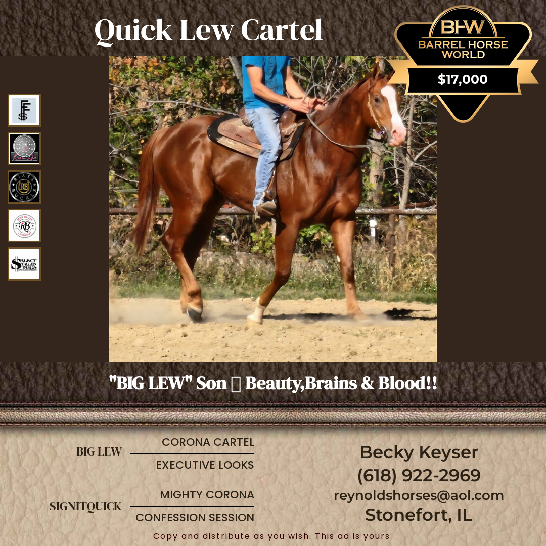4-year old - 2021 AQHA Gelding " Quick Lew Cartel " Son of Big Lew he is Absolutely Gorgeous with a tiny pretty little head full of Brains and a Body that is muscled up right! Good start on the pattern after a few outs on the track. H... (Hits 1418)